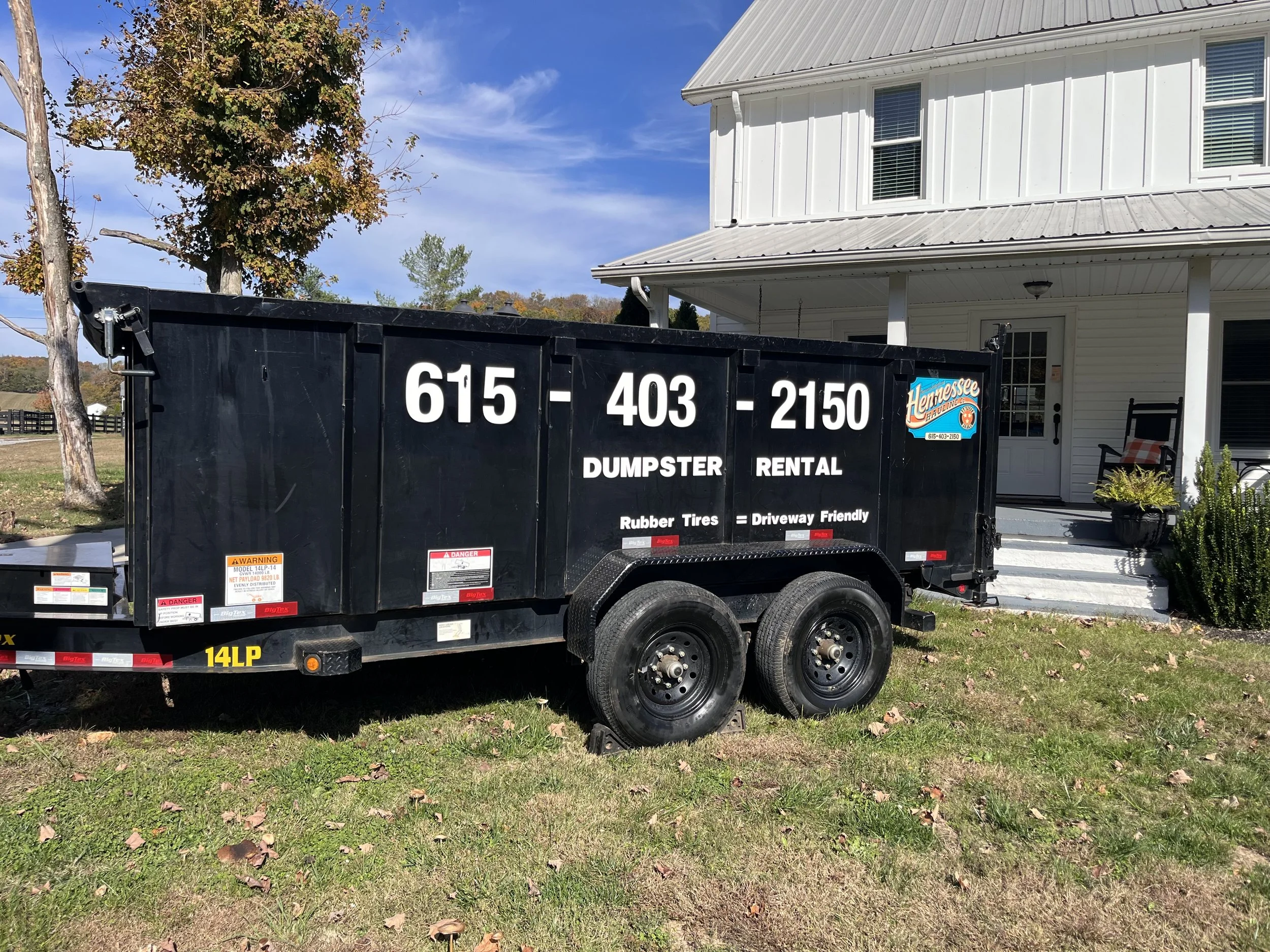 Our 15-yard Hennessee Hauling Co. dumpster are the perfect solution for residential cleanouts, small renovation projects, yard debris, and more. Compact enough to fit in a standard parking space, it offers plenty of room—holding roughly 80 to 100 trash bags—without overwhelming your property. Available as a 7-day rental, this dumpster is delivered by a standard pickup truck and designed to be driveway-safe, with easy-open rear doors that make ground-level loading simple and efficient. Clean, convenient, and reliable—it’s a smarter way to manage your mess.